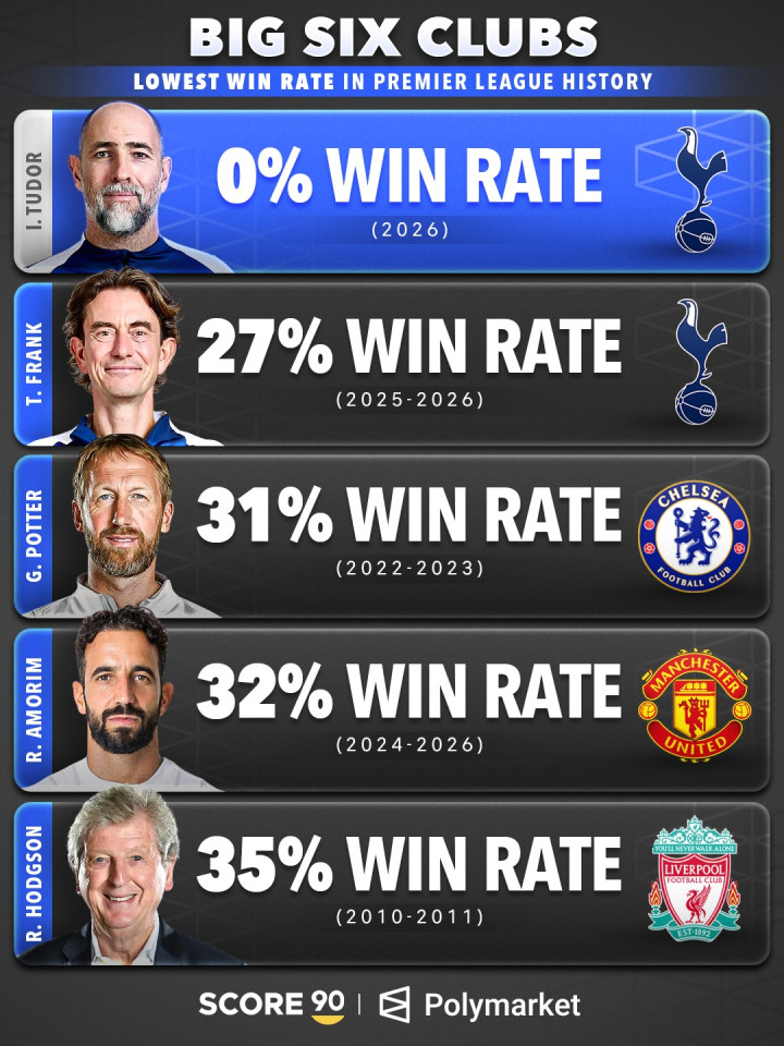 直播吧03月31日讯英媒Score90统计历史BIG6指导教练员的英超胜率,刚刚下课的图多尔0%最低,弗兰克倒二,阿莫林胜率32%上榜。